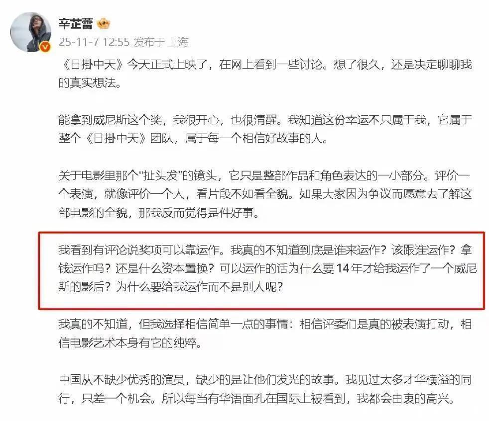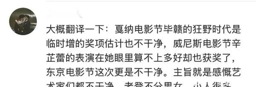 比如说拿钱买奖、评委不行之类的话,很多都说得挺模糊,偏偏有一句特别直白,直接说辛芷蕾拿威尼斯影后这事毫无含金量。